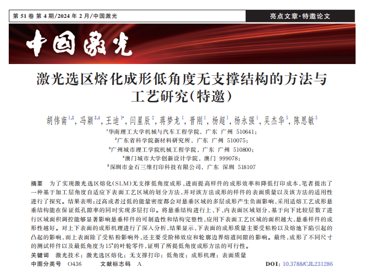 2024年2月,金石三維核心科研團隊——華南理工大學楊永強教授和王迪教授等在《中國激光》期刊聯合發表了題為《激光選區熔化成形低角度無支撐結構的方法與工藝研究》的特邀論文,對無支撐金屬打印的成形機理、樣件表面質量以及成形方法的適用性進行了探究,同時使用實際工業零件進行了打印驗證。