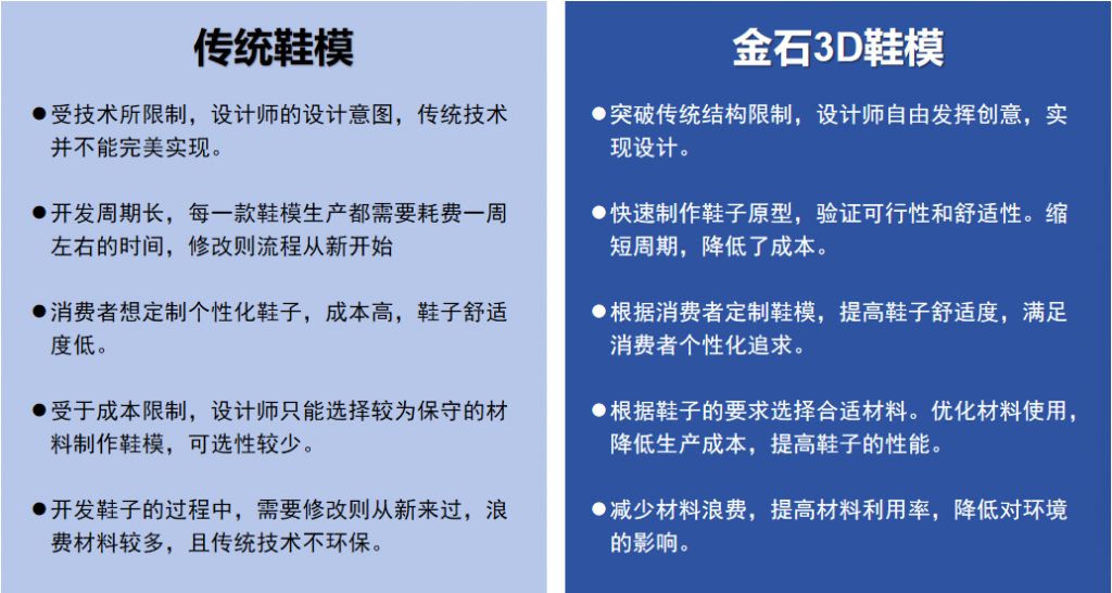 通過金石鞋模行業專用金屬3D打印機制作的鞋模,可減少木模、鑄造和咬花等繁雜工序,其成型件表面光潔,咬花紋路清晰,同時也降低了加工成本,相較于傳統制模工藝,交貨期可縮短一半以上。
