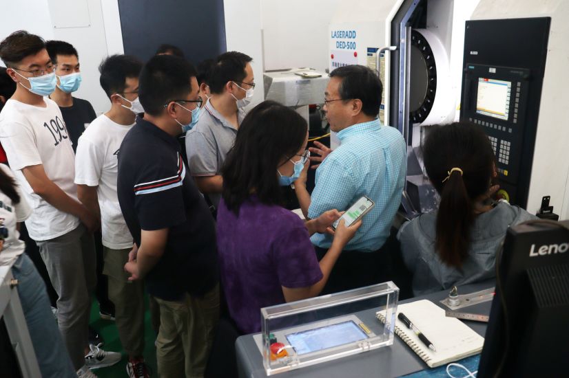 在陳董和楊教授等領導的帶領下,代表團首先參觀了雷佳增減材復合制造設備,四軸聯動數控增減材平臺LASERADD-DED-500H、激光定向能量沉積-銑削復合增材制造設備LASERADD-600。楊教授詳細地介紹了設備的原理、技術特點及應用領域。四軸聯動數控增減材平臺LASERADD-DED-500H基于定向沉積與4軸數控銑削加工研發的增減材復合制造加工設備,復合了傳統減材制造與增材制造兩種加工方式,可以加工高精度、高表面質量與高效成型具有復雜結構的金屬零件。激光定向能量沉積-銑削復合增材制造設備LASERADD-600,搖籃式五軸聯動精密加工中心,是一款擁有整體鑄件床身、動梁Y軸、高剛性搖籃三大優勢的新一代高端五軸設備,可實現高銑削效率、高加工性能和高精度,同時還具有較高的剛性和穩定性。用于復雜零件的精密制造。
